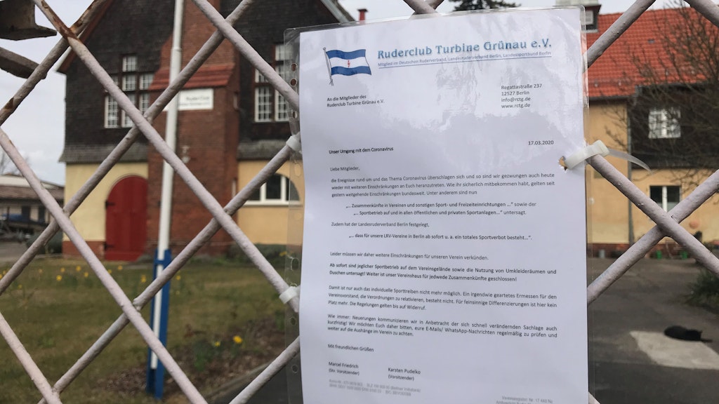 Und so liegen Motoryachten, Jollenkreuzer und Paddelboote weiter an Land. An den Pforten traditioneller Sportvereine, etwa an der Grünauer Regattastraße, hängen Schilder, auf denen das Bezirksamt auf die vom Senat erlassene Verordnung vom 14. März verweist. Danach ist der Sportbetrieb in allen öffentlichen und privaten Sportanlagen untersagt. Am Tor eines benachbarten Rudervereines hängt ein anderer Zettel, der auf die Vereinbarung zwischen der Bundesregierung und den Regierungschefs der Länder vom 16. März verweist. Danach sind auch Zusammenkünfte in Vereinen und sonstigen Sport- und Freizeiteinrichtungen verboten.